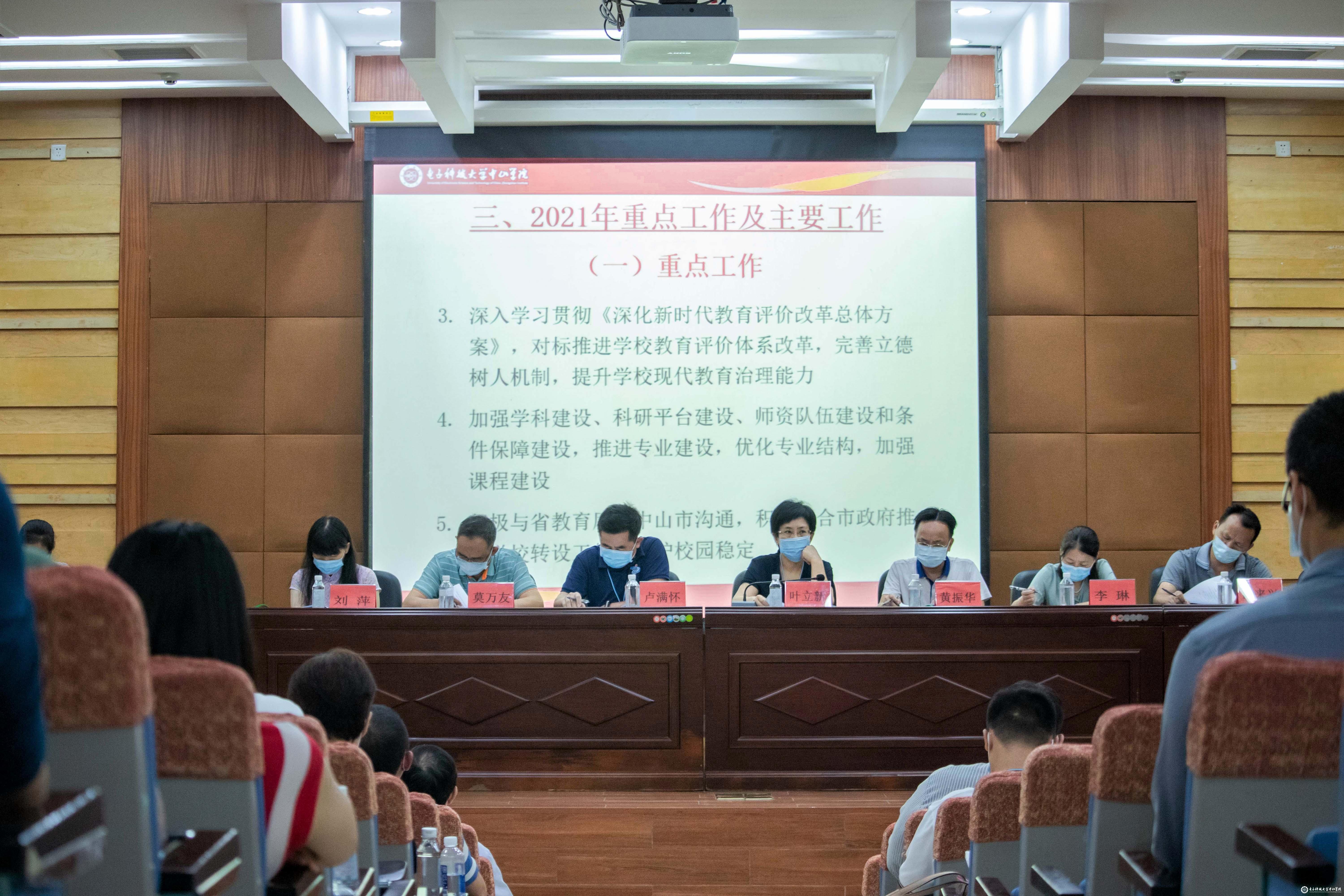 徐建华院长向大会作《学校工作报告》,他从疫情防控、思想工作、人才培养、“强特色”建设、师资队伍建设、招生就业工作、学生工作、对外合作、后勤保障、平安校园建设、校园文化建设共11个方面总结回顾了学校在2020年所开展的工作和取得的成绩,同时介绍了学校2021年的重点工作和主要工作。