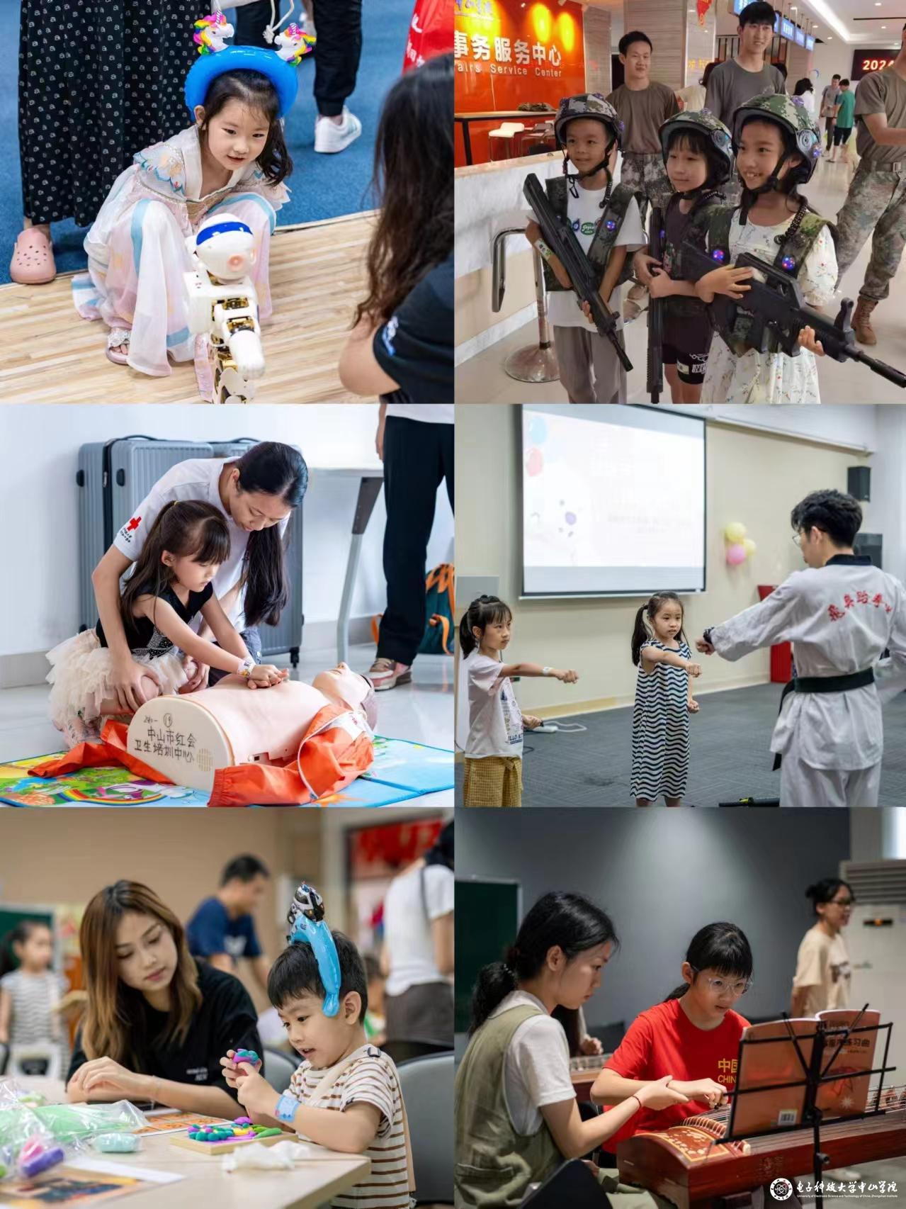 本次活动设置了41个兴趣体验项目和趣味类游戏项目。兴趣体验项目由学校具有相关专长的教职工及学生社团骨干担任助教。在专业老师、学生骨干的示范讲解和实操体验下,孩子们积极参与其中,其乐融融。活动现场,孩子们通过编程和遥控操作机器人快速走位腾挪,亲身体验小型无人机试飞、3D打印等活动;与大学生哥哥姐姐们 “同台竞技”棋艺、魔方,体验各类乐器、舞蹈表演、书画创作等;沉浸式感受军事爱好者协会的模拟枪装备,畅享模拟射击带来的极致体验;在羽毛球、乒乓球、跆拳道、飞镖等体育运动中收获运动带来的欢乐。